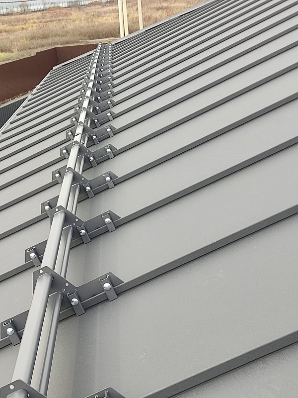 Комплект изготовлен из оцинкованной стали с полимерным покрытием, что обеспечивает его долговечность и защиту от атмосферных воздействий. Труба и опоры имеют прочную конструкцию, способную выдерживать значительные нагрузки от снега. Крепления разработаны специально для фальцевой кровли, что гарантирует надежное и безопасное крепление.